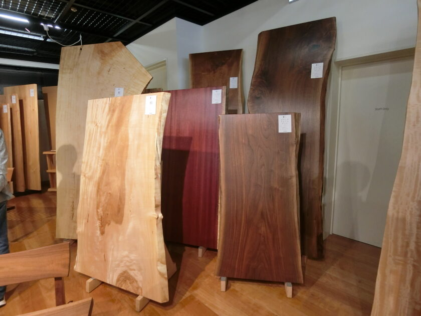新潟ではあまり目にしない一枚板や無垢板が100枚以上も揃えられており、
