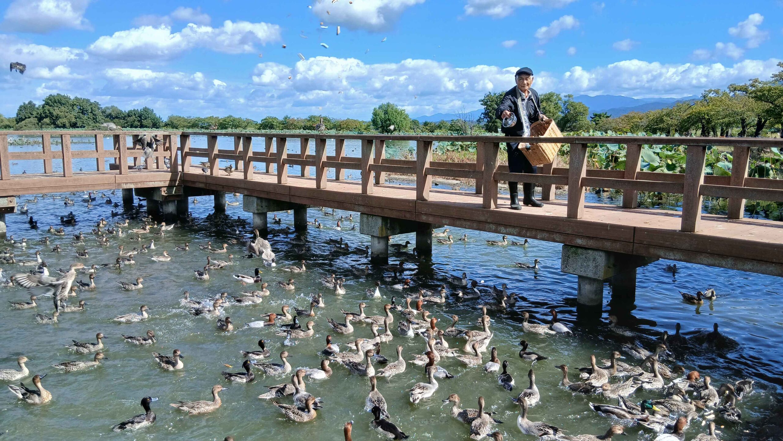 ちょうど午前11時の餌やりの時間でしたが、白鳥おじさんのパンくずに寄って来るのはカモ達ばかり。ハクチョウは水面で優雅に漂っています。さっと見たところ100羽位でしたが、掲示板には「10月10日現在 飛来数1,077羽」の文字。日中は、稲刈りを終えた田んぼで落ち穂をついばんでいるのでしょう。