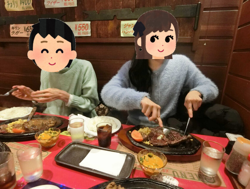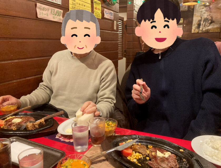 訪れたのは正月2日の12時30分頃。店内はほぼ満席でしたが、運よく4人掛けのテーブルに案内されました。まず驚いたのが、注文してから1分も経たないうちに料理が運ばれてきたことです。店長さんの「安く、早く、うまい」というモットーを反映しているのだとか。今回いただいたのは「ジャンボ・ハンバーグ(400g)」と「1/2ポンドステーキ」。40年前の味の記憶は正直おぼろげでしたが、50年近くも愛され続けていることに納得のいく、力強く美味しい味わいでした。また息子たちが帰省した際にはぜひ立ち寄りたい、おすすめの名店です。