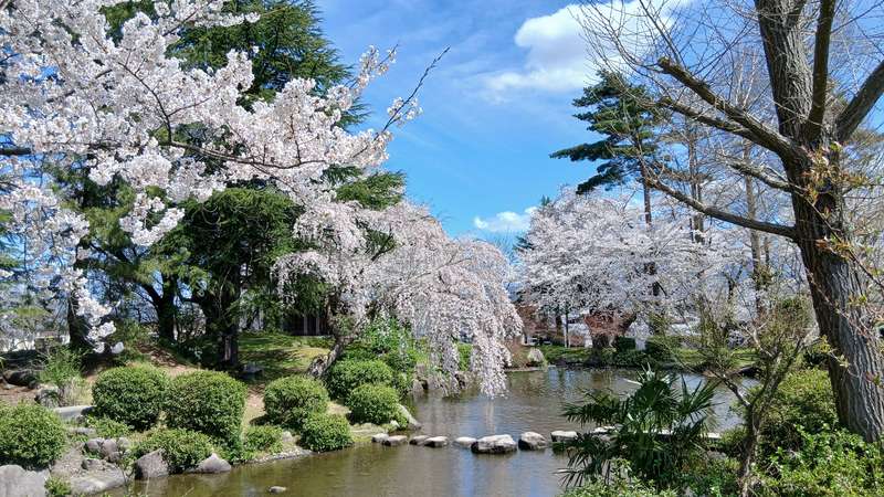 4月6日(月)、朝からの心地よい日差しに誘われ、家内と桜を愛でに出かけてきました。出発の前、まずは地元・早通の「認定こども園」へ。この4月から保育園から移行したばかりの新しい門出で、私は役員として入園式に参列させていただきました。園庭の桜はちょうど満開。13名の新入園児のうち半数が0歳児ということで、明日からはしばらく、可愛らしい泣き声が園内に響き渡りそうですね。式典を無事に終え、早速出発です。目的地は車で40分ほど、阿賀野市にある「天朝山(てんちょうやま)」です。ここは明治初期、下越の政治拠点として「越後府」が置かれた歴史ある場所。普段は道路沿いから眺めて通り過ぎてしまうのですが、今回はこの小高い丘の上まで登り、築山を彩る満開の桜をじっくりと堪能しました。平日のためか人影もまばらで、静かな時間の中で春を満喫することができました。