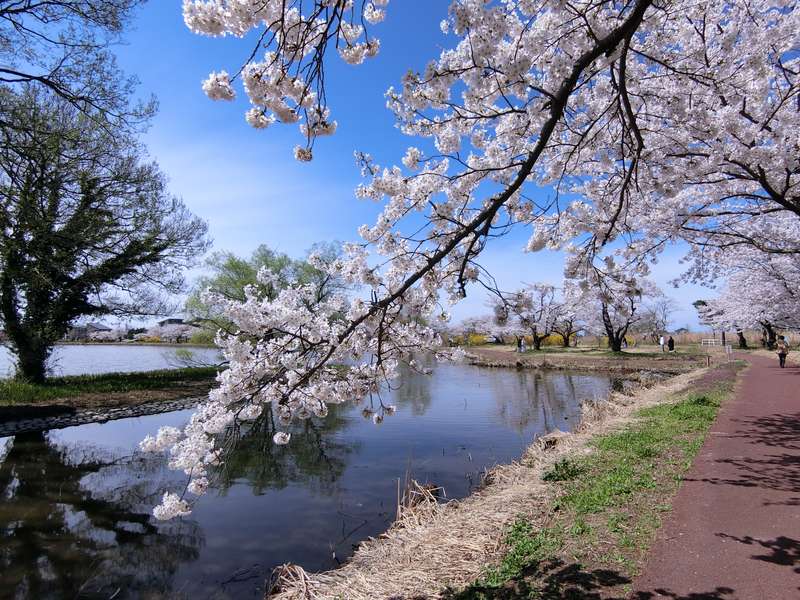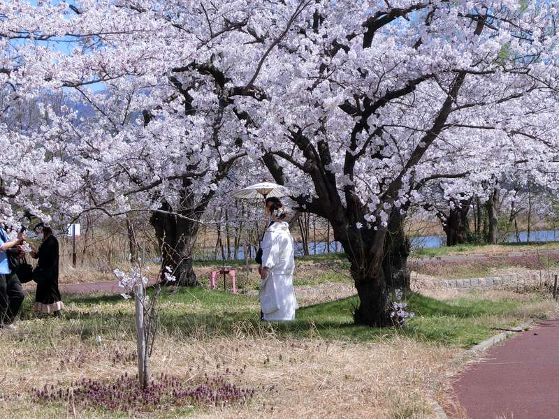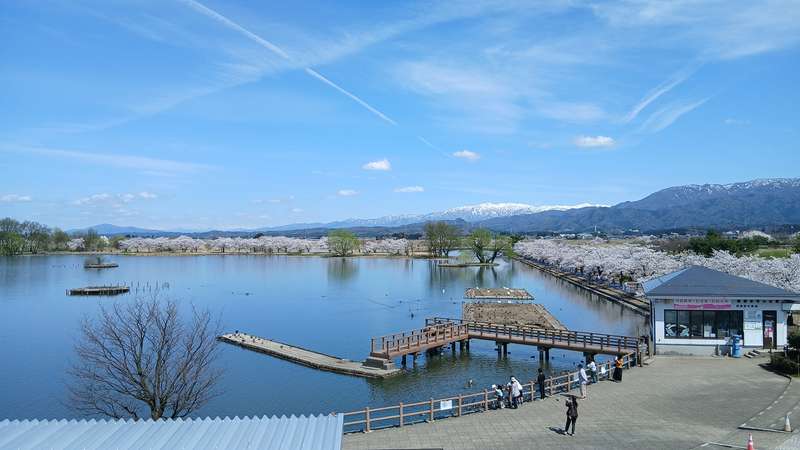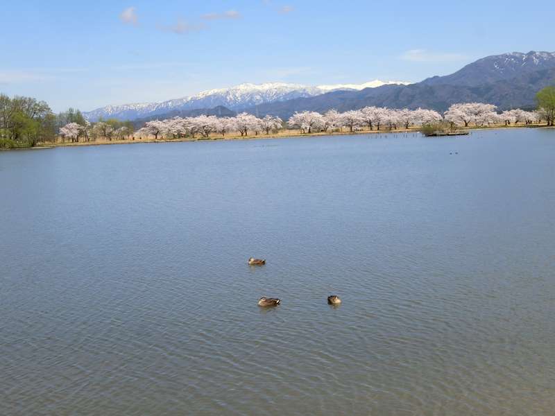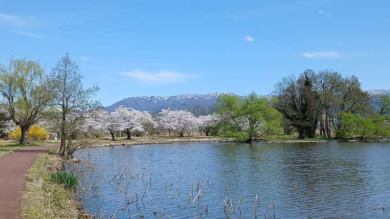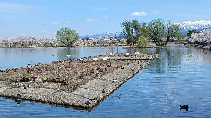 続いて、すぐ近くの「瓢湖」へ足を伸ばしました。湖畔の桜も見頃を迎えており、そこにはまだ北へ帰らずに羽を休めているハクチョウやカモたちの姿が。背後にそびえる五頭連峰の残雪、青い湖面、そして満開の桜が織りなす景色は、まさに一枚の絵画のような美しさでした。折しも、満開の桜を背に幸せいっぱいの新婚さんがブライダルフォトの撮影をしており、こちらまで幸せな気分を分けていただいたような気がします。 池を一周して少し汗ばんだ体に、冷たいものが欲しくなりました。