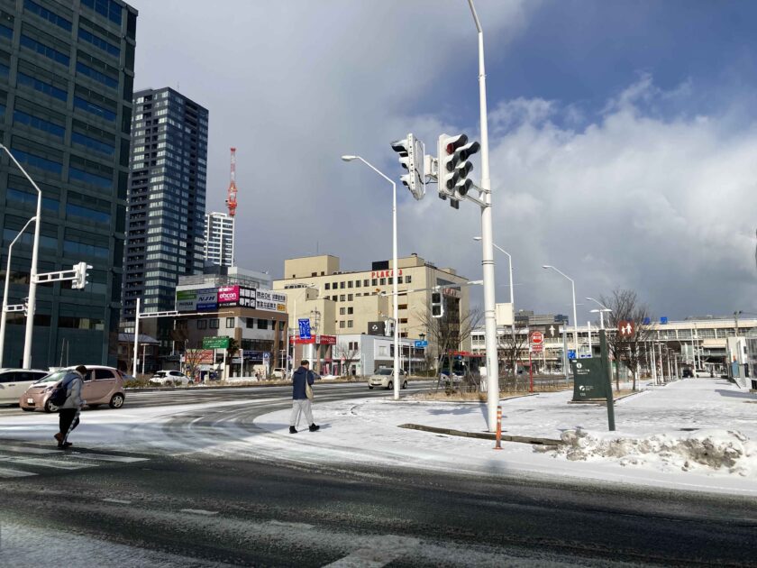 左の写真は新潟駅南口の状況です。雪が薄っすらとあります。朝9:45に撮影したものです。