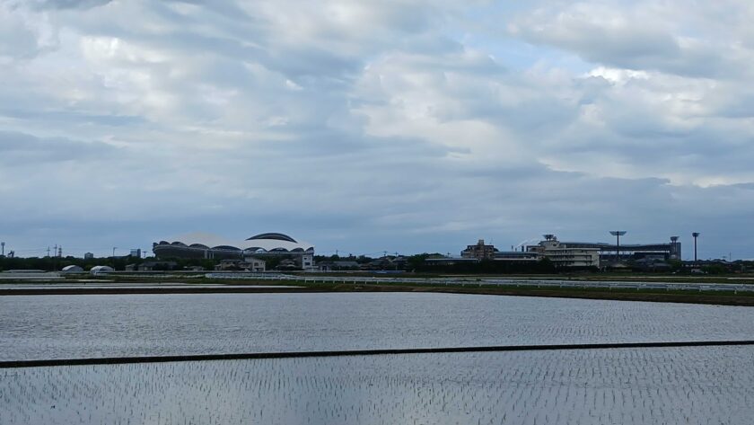 GW頃から始まった田植えもほぼ終わり田んぼに水を張った様子です。後方左はサッカー場「ビッグスワン」、右は野球場「ECOスタジアム新潟」