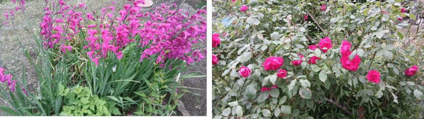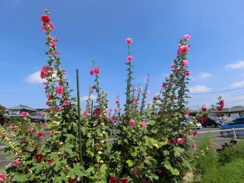 K氏宅の畑の隅に咲いていた、ホリホック(和名:立葵)開花時期:6~8月頃で、梅雨の時期に開花し、梅雨明け頃に一番上の花が咲くと言われています。新潟はまだ梅雨明けなしです。