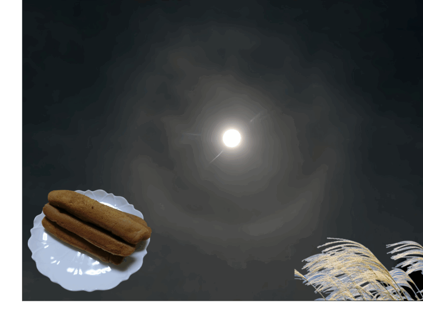 自宅で撮影したスーパームーン(月が地球に最も近づいた位置での満月)最接近の時刻です。左下は団子ならぬポッポ焼きです(三条市で買ってきました)。「月がさ(リング)」が見れました、幸運が訪れる前触れだそうです。
