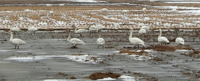左の写真は、田んぼにハクチョウが落ち穂を食べています。(2/23 10:30撮影)